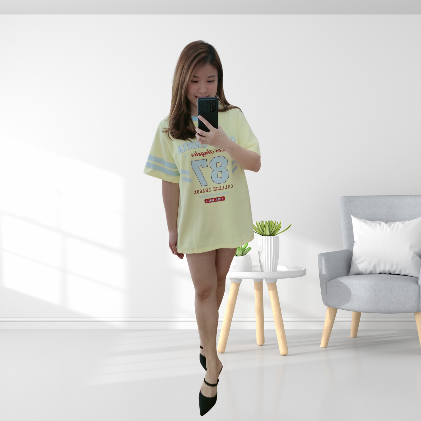 CODE: 5061 (NP:RM49) Colour: Black/Yellow/Purple/Pink Free Size ~ B106cm L69cm ✅ 弹力棉质面料,舒适透气 ✅ 圆领 + 字母印花设计,时尚百搭 ✅ 宽松版型,显瘦遮肉,轻松穿出美式风 📌 模特参考: 👩 妹妹:156cm | 86/68/88 穿 舒服 👩 姐姐:155cm | 92/76/98 穿 舒服 🔥 美式潮流 × 百搭必入,轻松搭牛仔裤、短裤!