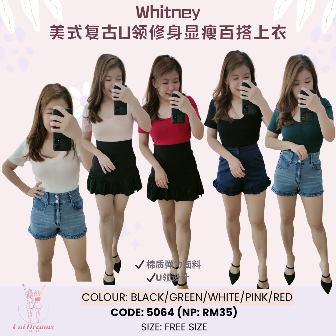 CODE: 5064 (NP:RM35) Colour: Black/Green/White/Pink/Red Free Size ~ B80-94cm L55cm ✅ 柔软弹力棉质,舒适透气 ✅ 美式复古 U 领设计,修饰颈部线条 ✅ 修身显瘦版型,百搭必收 📌 模特参考: 👩 妹妹:156cm | 86/68/88 穿 舒服 👩 姐姐:155cm | 92/76/98 穿 舒服 🔥 百搭上衣 × 显瘦神器,通勤、休闲、约会都OK!
