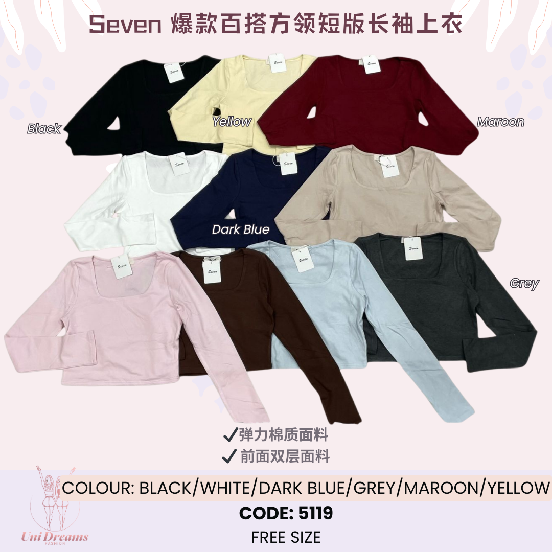 ✨❤️ 新品上架 | 爆款推荐 ❤️✨ 💖 Seven 爆款热卖百搭方领短版长袖上衣 CODE: 5119 原价 RM42 Free Size: B80–92cm|L37cm 颜色选择: Black / White / Dark Blue / Grey / Maroon / Yellow ✨ 商品亮点 ✅ 舒适双层弹力棉质面料,亲肤柔软、不闷热 ✅ 经典方领设计,显瘦显锁骨 ✅ 简约百搭版型,单穿就超好看,内搭外套更轻松驾驭