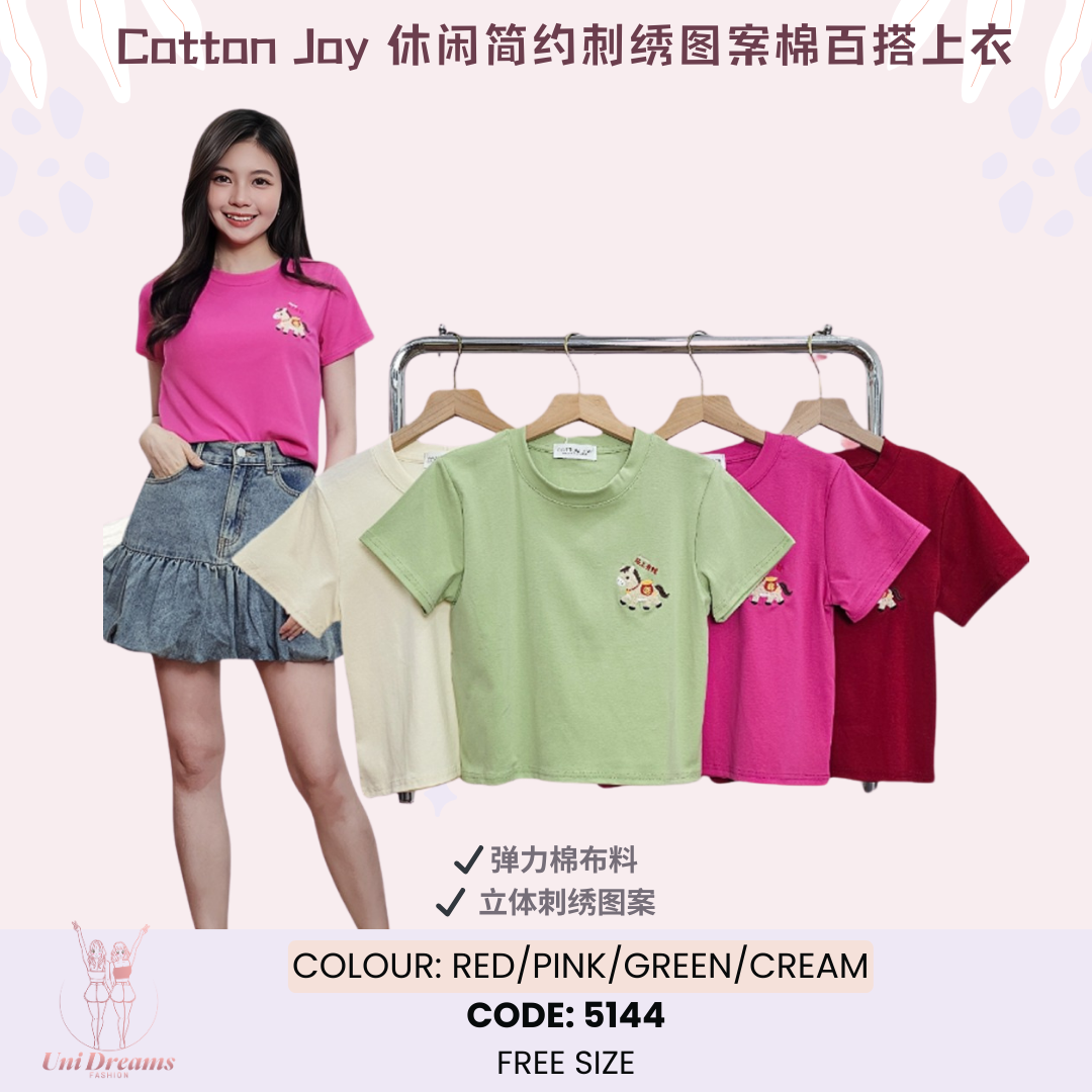 ✨❤️ 新品上架 | 爆款推荐 ❤️✨ 💖 Cotton Joy 休闲简约刺绣图案百搭上衣 CODE: 5144 原价 RM35 颜色选择: Red / Pink / Green / Cream Free Size: B80–92cm|L44cm ✨ 商品亮点 ✅ 弹力棉质面料,亲肤柔软、透气不闷热 ✅ 精致图案刺绣,简约中带点时尚小细节 ✅ 微短版剪裁,轻松 拉长身高比例、显腿长
